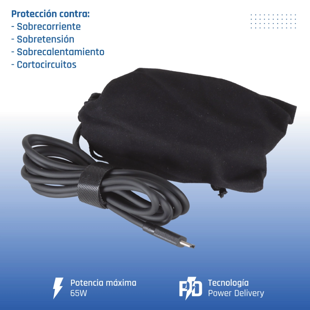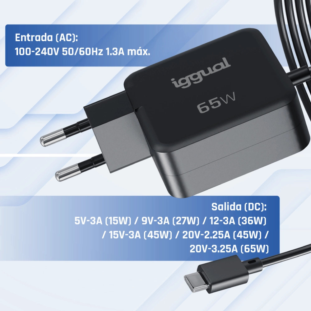- Salida (DC): 5V-3A (15W) / 9V-3A (27W) / 12-3A (36W) / 15V-3A (45W) / 20V-2.25A (45W) / 20V-3.25A (65W)